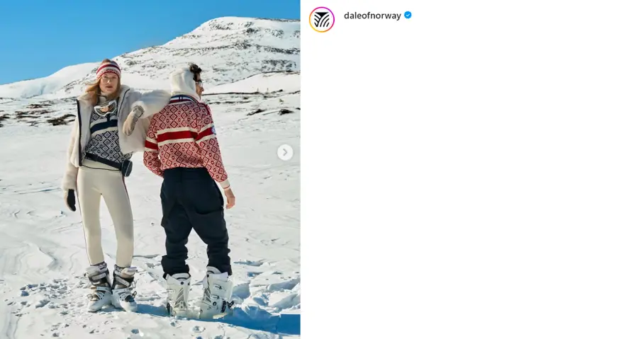 Norveç’in olimpiyat kazaklarını tasarlayan Dale of Norway, geleneksel nordik geometrik deseni modern bir şekilde yorumluyor. Kazaklarda Norveç yünü kullanılıyor.