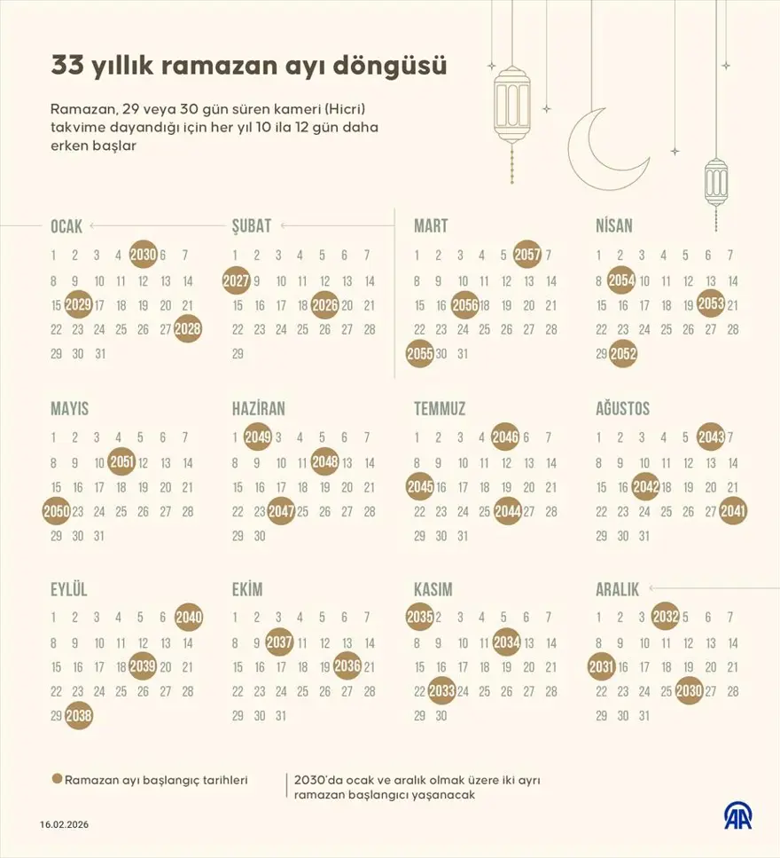 2026 yılı Ramazan ayı yarın idrak edilecek. 19 Şubat Perşembe günü başlayacak Ramazan ayının son günü 19 Mart olacak ve 20 Mart, Ramazan Bayramı’nın ilk günü olarak kutlanacak. Bundan 4 yıl sonra ise 33 yıllık büyük döngü tamamlanacak ve aynı yıl içinde 2 kez Ramazan ayı denk gelecek.