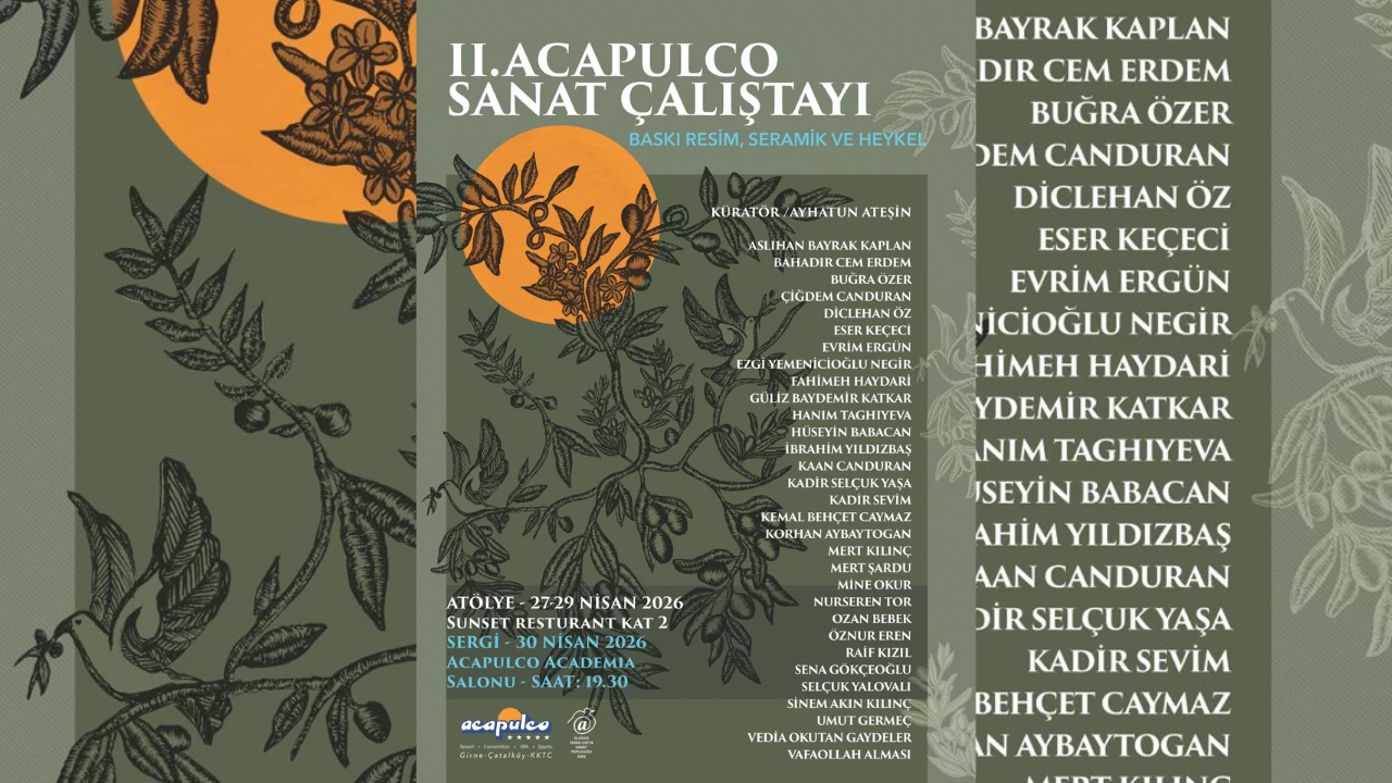 Kıbrıs’ın kültür ve sanat yaşamına katkı sunan Acapulco 2. Sanat Çalıştayı, bu yıl “Akdeniz’in Sessiz Tanığı; Zeytin” temasıyla sanatseverlerle buluşuyor. Küratörlüğünü Ayhatun Ateşin’in üstlendiği etkinlik, Alashia Terracotta Sanat Topluluğu iş birliğiyle 27 Nisan’da Acapulco’da başlayacak.