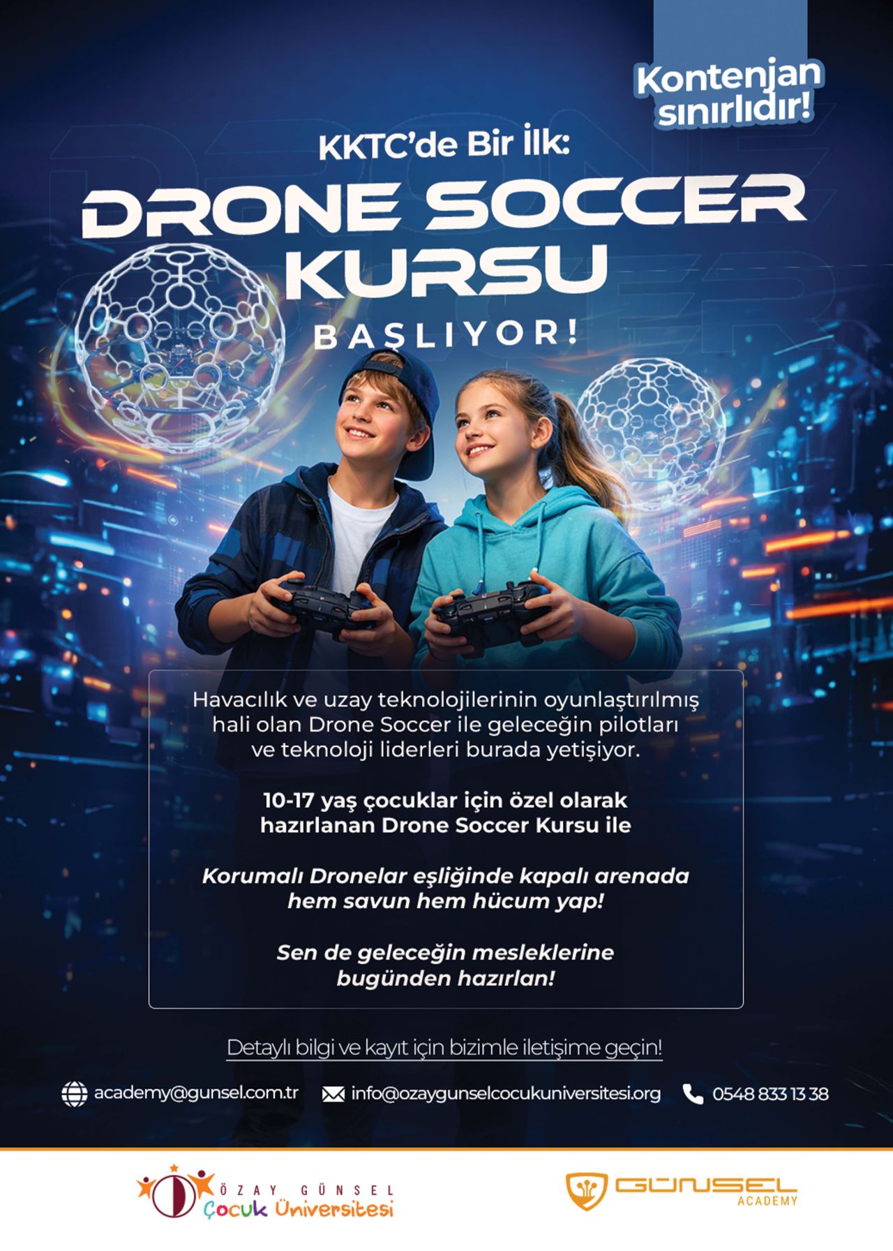 Kıbrıs’ta teknoloji ve sporu bir araya getiren dikkat çekici bir eğitim programı hayata geçiriliyor. Özay Günsel Çocuk Üniversitesi ile GÜNSEL Akademi iş birliğinde düzenlenen Drone Soccer Kursu, 10–17 yaş aralığındaki gençler için kapılarını açıyor.