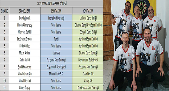 Kuzey Kıbrıs Darts Federasyonu tarafından organize edilen 2025 – 2026 Tuborg Darts Birinci Liginde ilk yarı tamamlanırken, ilk yarı sonunda transfer dönemi sona erdi. Kulüpler arası ve yeni çıkarılan lisanslara.