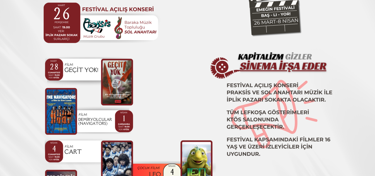 Kıbrıs’ta kültür ve sanatın önemli buluşmalarından biri olan 14. Uluslararası Kıbrıs İşçi Filmleri Festivali, 26 Mart...