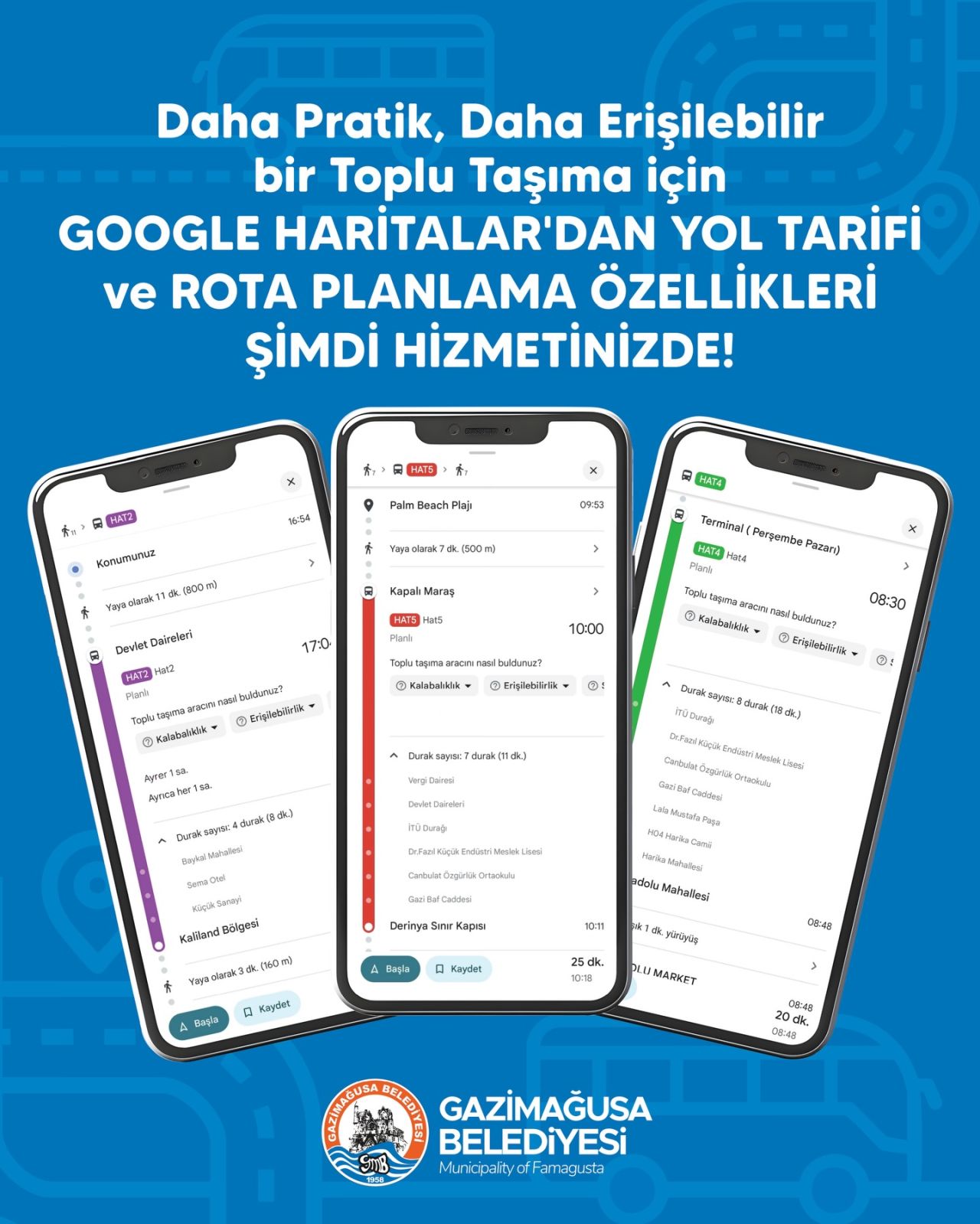 Gazimağusa Belediyesi’nin hayata geçirdiği “Esnek Toplu Taşıma Sistemi”, dijital altyapı çalışmaları kapsamında Google Haritalar ile entegre edildi.