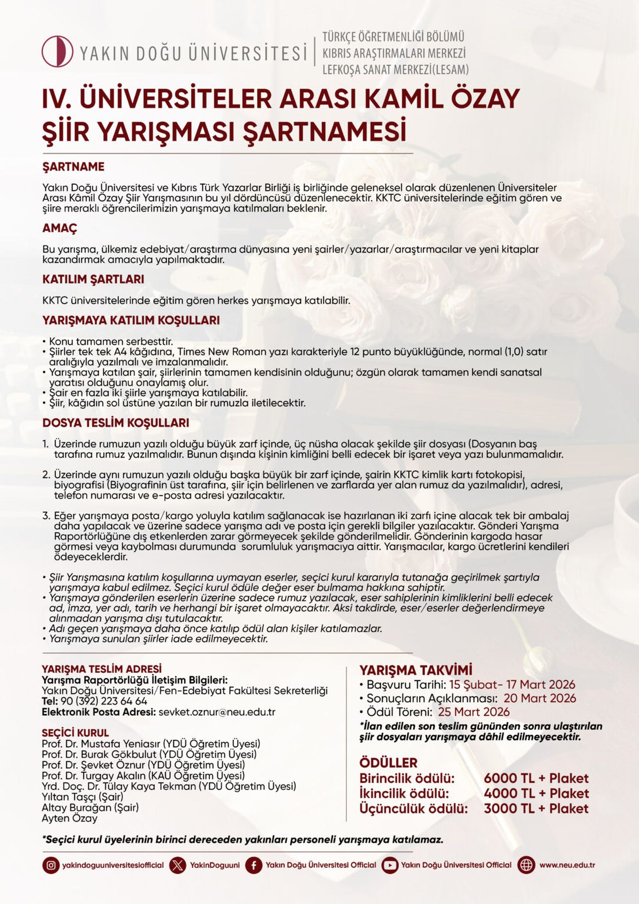 Her yıl geleneksel olarak gerçekleştirilen Üniversiteler Arası Kamil Özay Şiir Yarışması, bu yıl dördüncü kez genç kalemlere kapılarını açıyor. Organizasyon; Yakın Doğu Üniversitesi Türkçe Öğretmenliği Bölümü, Kıbrıs Araştırmaları Merkezi ve Lefkoşa Sanat Merkezi iş birliğiyle hayata geçirilecek. Yarışma, şiire ilgi duyan ve özgün eserleriyle kendini ifade etmek isteyen üniversite öğrencilerine önemli bir platform sunuyor.