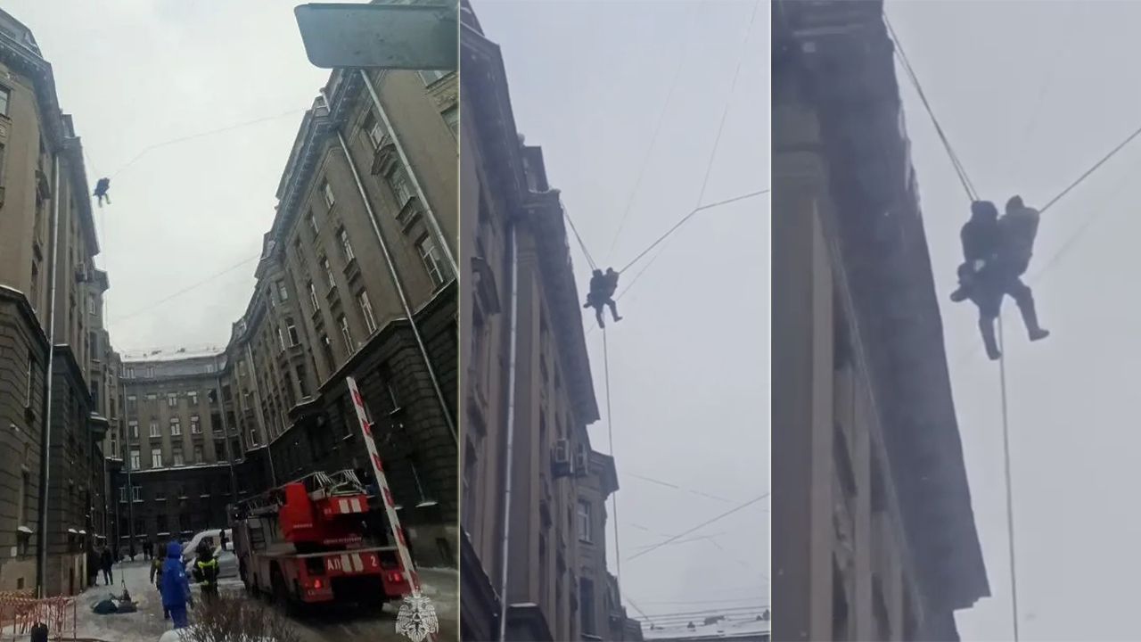 Bir temizlik görevlisi, güvenlik kemeri takmadan 6 katlı bir binanın çatısında kar kürediği sırada kaydı. Çatıdan düşen görevli, son anda bir elektrik kablosuna tutundu.