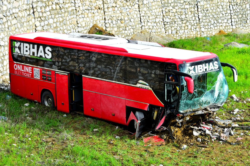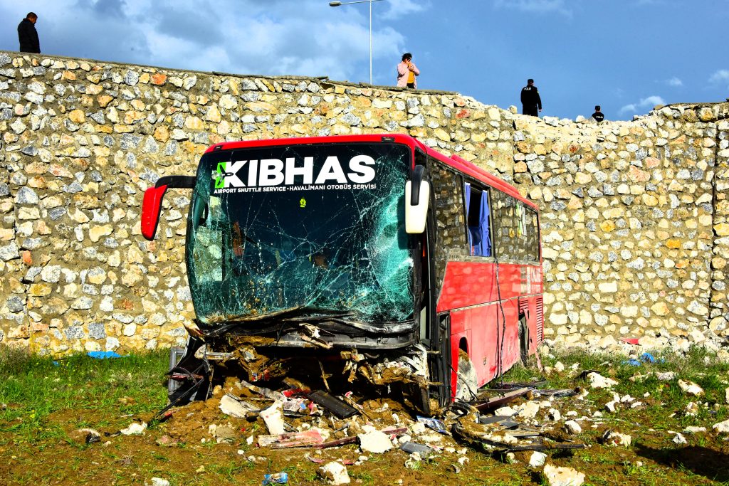 Kontrolsüz şekilde yoluna devam eden otobüs, çember içerisinden geçip yolun solunda bulunan taş duvara çarptıktan sonra yaklaşık 6 metre derinliğindeki tarla içerisine düşerek tekerlekleri üzerinde durdu.