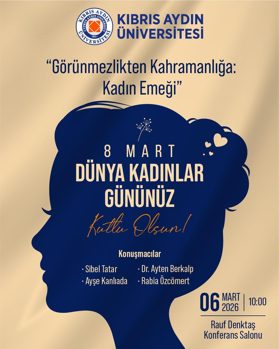 Kıbrıs Aydın Üniversitesi, 8 Mart Dünya Kadınlar Günü kapsamında özel bir etkinlik düzenliyor. “Görünmezlikten Kahramanlığa: Kadın Emeği” başlıklı program, 6 Mart 2026 tarihinde saat 10.00’da Rauf Denktaş Konferans Salonu’nda gerçekleştirilecek.