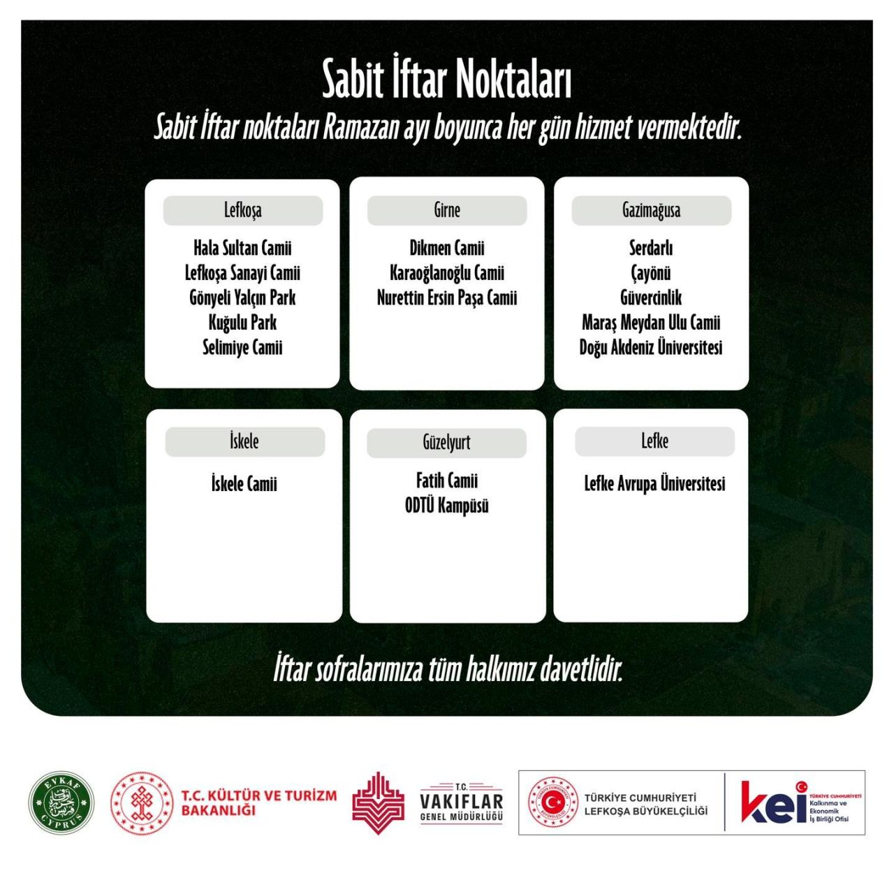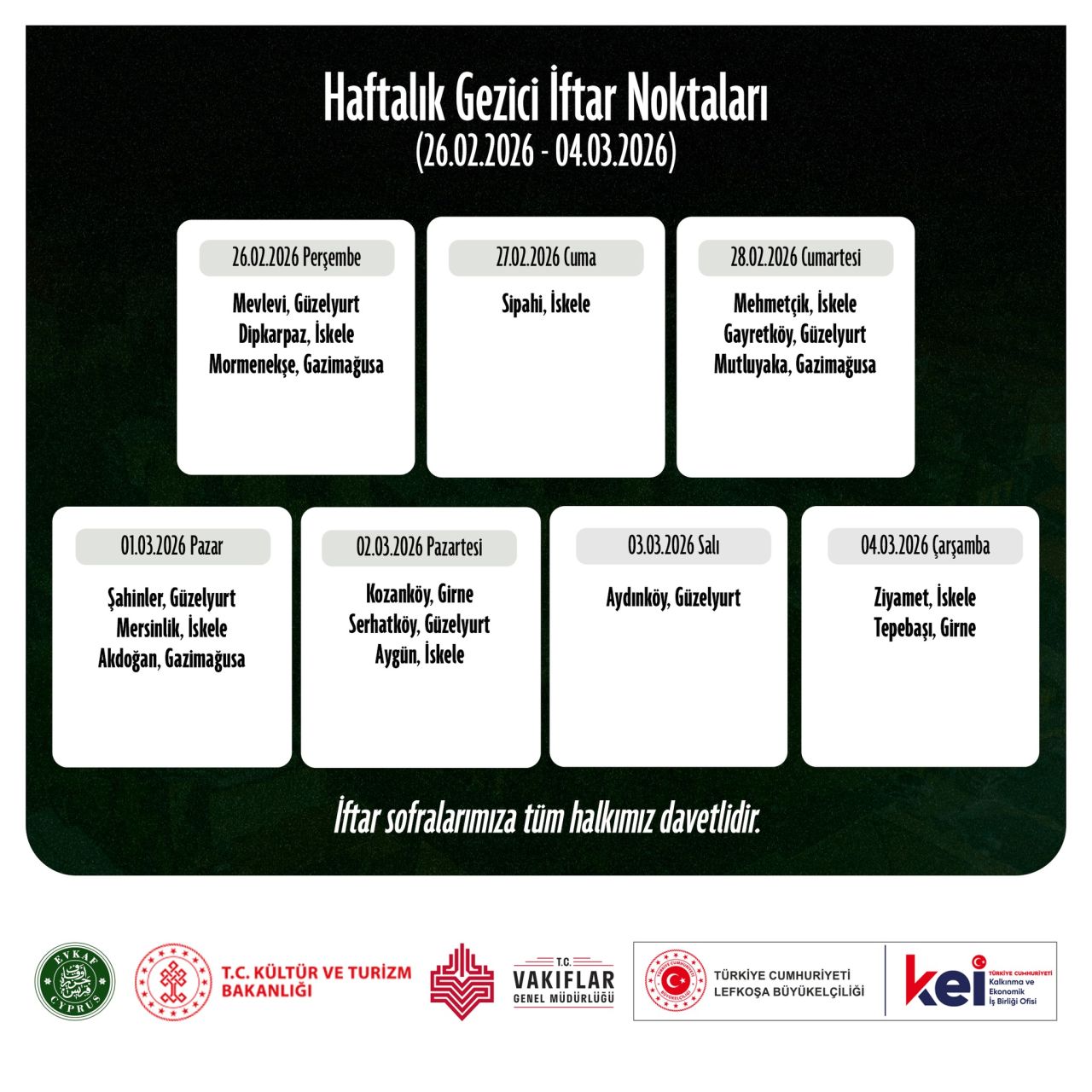 Ramazan ayının huzur ve paylaşma ruhunu yaşamak amacıyla Kıbrıs Vakıflar İdaresi, T.C. Kültür ve Turizm Bakanlığı Vakıflar Genel Müdürlüğü ve T.C. Lefkoşa Büyükelçiliği Kalkınma ve Ekonomik İş Birliği Ofisi iş birliğiyle organize edilen iftar sofraları tüm halkın katılımına açık olacak.