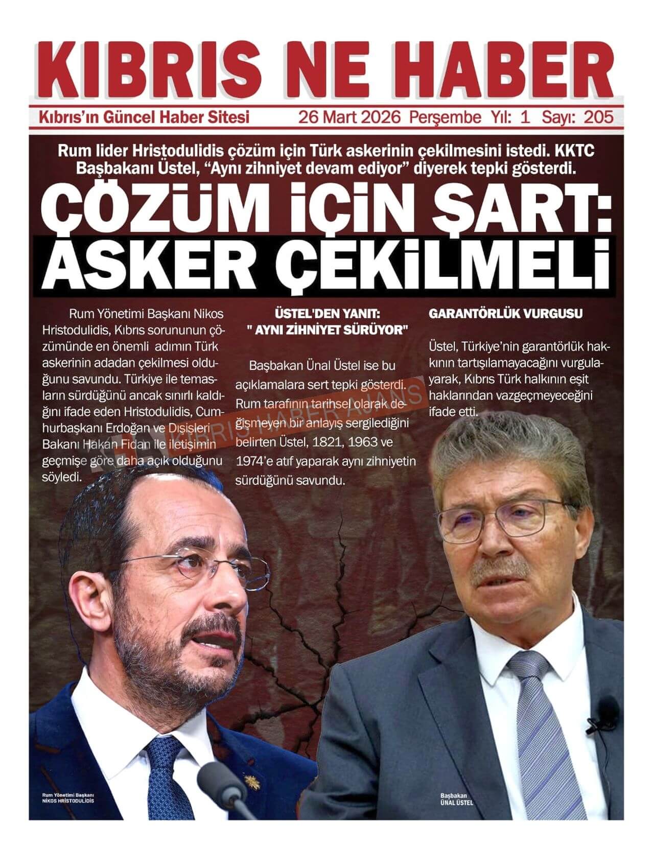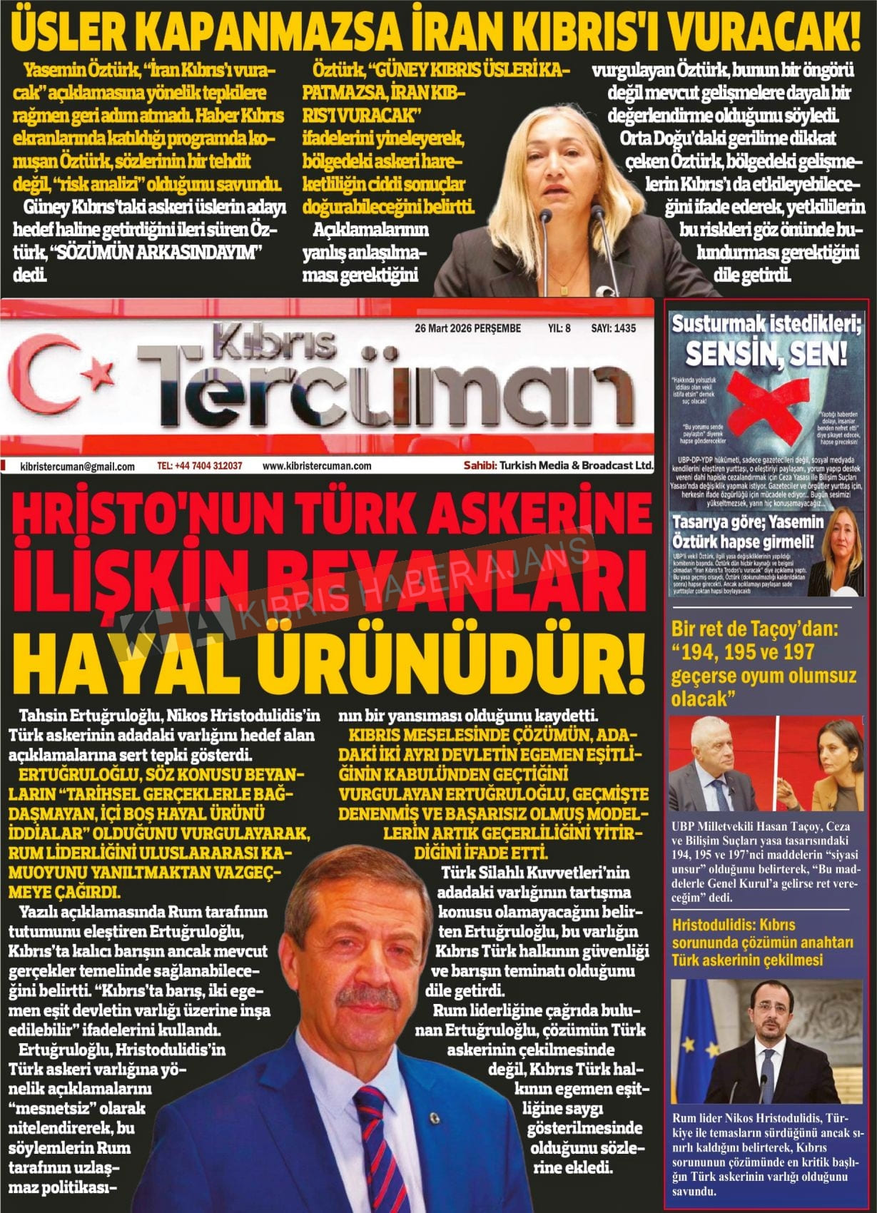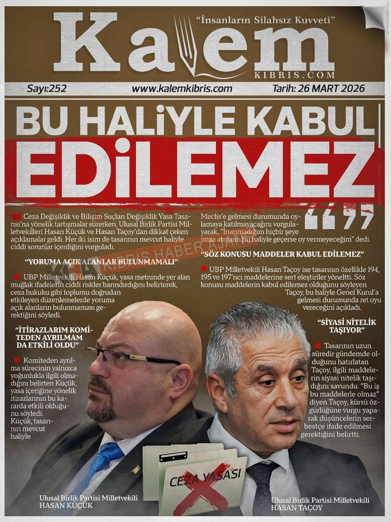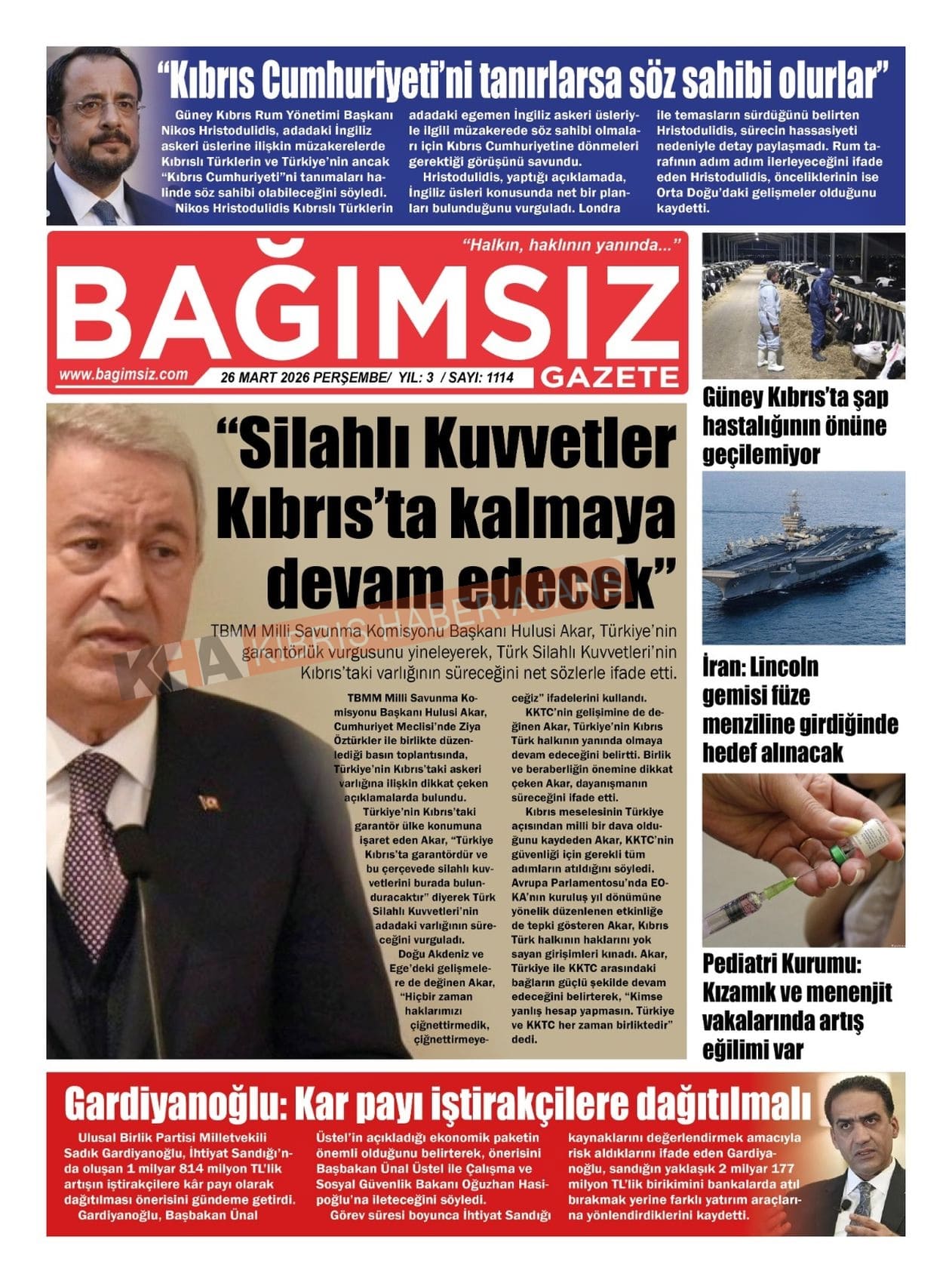 Sitede yayınlanan gazetelerdeki içeriklerden gazete sahipleri sorumludur. Yayınlanan gazeteler ve içeriklerinden Kıbrıs Haber Ajans ve Ajans Cyprus sorumlu tutulamaz.
