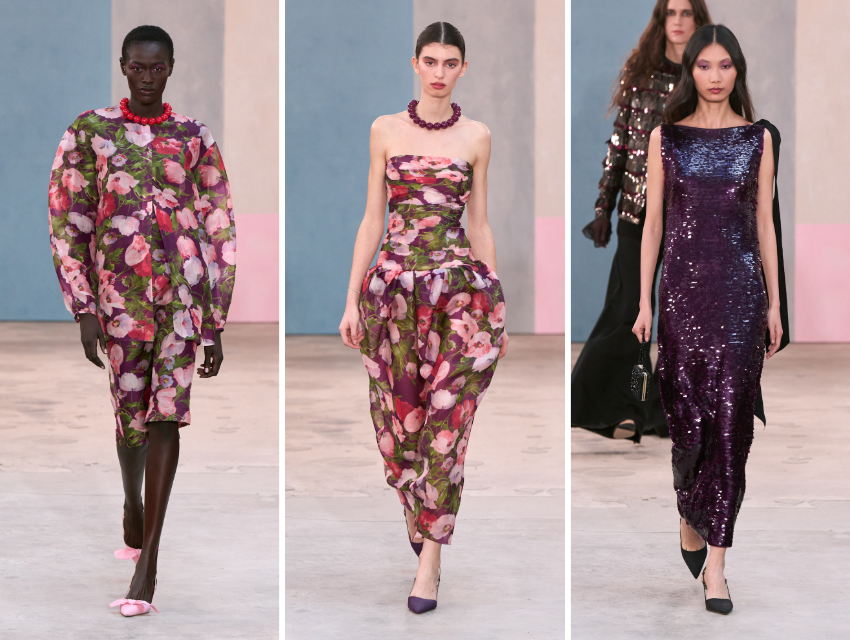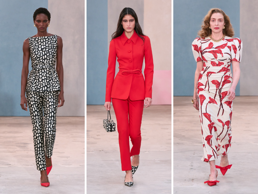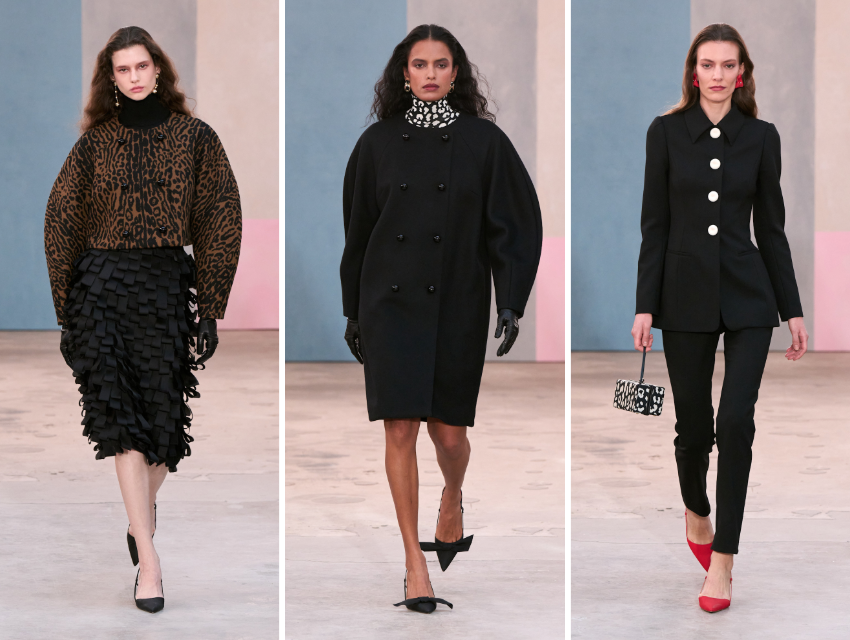 Aksesuarlar bu kontrollü gösterişi dengeledi. Fiyonk detaylı kitten heel ayakkabılar, metal çiçek aplikeli kutu çantalar ve aynı metal detayın tekrarlandığı elbiselerle görünümü tamamladı. Hayvan motifleri ve markanın ikonik Good Girl parfüm şişesinden ilham alan stiletto çizimi, gömlekler ve kalem etekler üzerinde grafik bir vurgu yarattı. Calla lily çiçekleri ise hem düğme detaylarında hem baskılarda tekrarlandı.