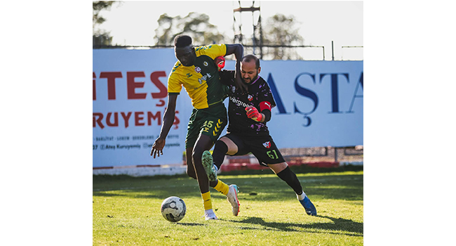Mağusa Türk Gücü’nün 3 – 1’lik skorla galip ayrıldığı karşılaşmada Mağusa Türk Gücü futbolcusu Papa Demba ile Esentepe kalecisi Ali Karal arasındaki mücadele dikkat çekti.