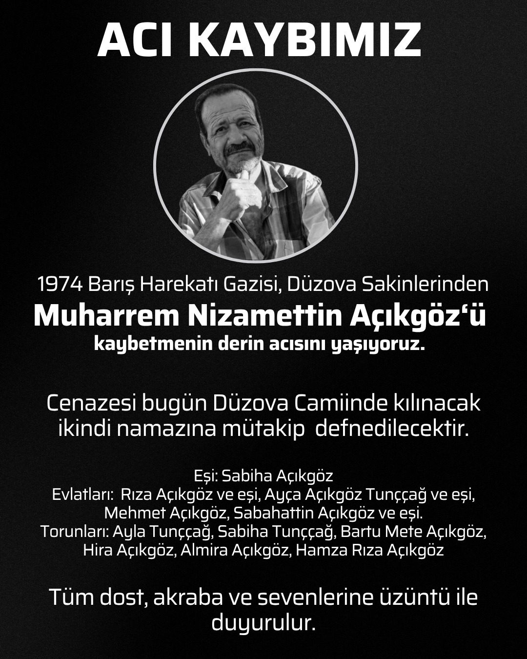Merhum Muharrem Nizamettin Açıkgöz’ün cenazesi, bugün (27 Nisan) Düzova Camii’nde kılınacak ikindi namazına müteakip son yolculuğuna uğurlanacak.