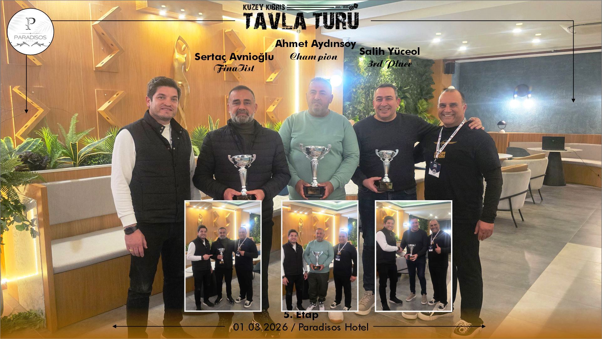 2026 yılının üçüncü buluşmasında, Kıbrıslı tavla severler Lefkoşa’da bulunan Paradiso Otelde bir araya geldiler. Kuzey Kıbrıs’ın dört bir yanından gelen oyuncularımızın katılımı ile gerçekleşen Kıbrıs Tavla Turu 5. Etap maçları, büyük bir centilmenlik ve rekabete sahne oldu.