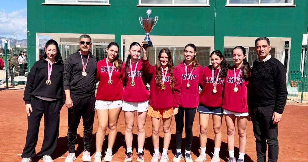 Levent Koleji Genç Kız Tenis Takımı, Kuzey Kıbrıs Tenis Federasyonu kortlarında şampiyonluk kupasını gururla havaya kaldırırken, okul öğretmenleriyle şampiyonluk gururunu yaşadılar.