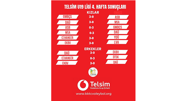 Telsim Voleybol U19 Liglerinde dün akşam oynanan 5, 4. Hafta müsabakaları sonucunda Erkeklerde DTSK 12 puanla, A Grubu Kızlarda DAÜ 12 punala, B Grubu Kızlarda EKBV 12 puanla yenilgisiz liderliklerini devam ettirdi.