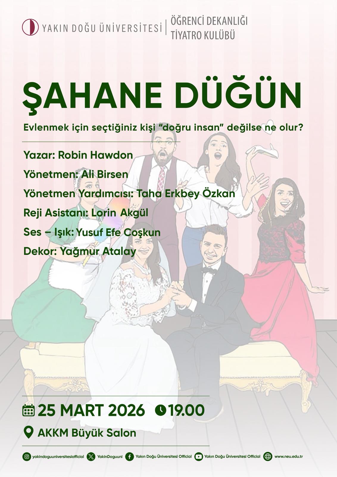 Dünyanın ilk 500 üniversitesi arasında yer alan Yakın Doğu Üniversitesi, 27 Mart Dünya Tiyatro Günü kapsamında öğrencilerini ve tiyatroseverleri sahnesi dolu komedi ve sürprizlerle buluşturuyor. Üniversitenin Öğrenci Dekanlığı ve Tiyatro Kulübü iş birliğiyle sahneye taşınan “Şahane Düğün”, izleyicilere düğün kaosu, yanlış anlamalar ve bol kahkaha dolu bir akşam vaat ediyor.